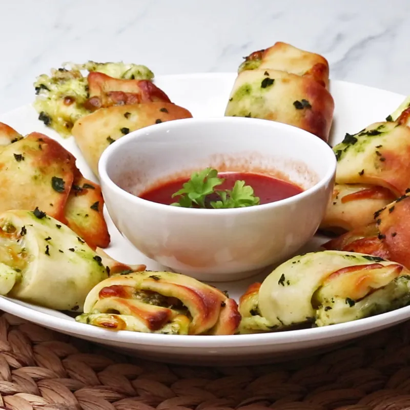 - 6 Make The Halloumi Bites: Fold the bottom of the triangle dough up over the halloumi until it’s covered, and then continue to roll the dough up until the tip of the triangle is reached (similar to a croissant) Repeat with the remaining dough, pesto and cheese.
