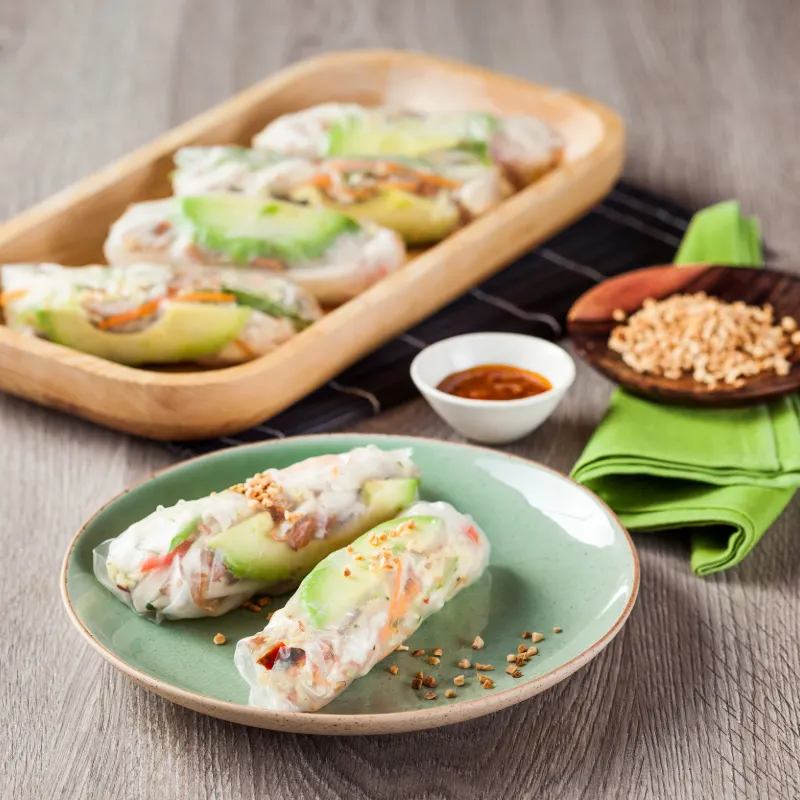 - 3 Place a slice of avocado in the lower middle end of sheet, top with a little meat, slaw, sprouts, fried shallots & crispy noodles Fold the bottom half up over the filling, then the left side in, followed by the right side, then roll up tight to form a roll. Repeat with remaining rice paper and filling ingredients.