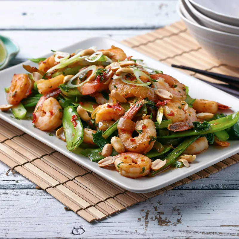 - 5 Pour the sauce over the vegetables in the wok, stirring to coat them evenly. Return the prawns to the wok and add the Lightly Dried Coriander. Continue to stir-fry for another 2-3 minutes, allowing the sauce to thicken and the prawns to heat through. Serve the prawn stir fry over steaming hot rice. Sprinkle with chopped peanuts and thinly sliced spring onions if desired.