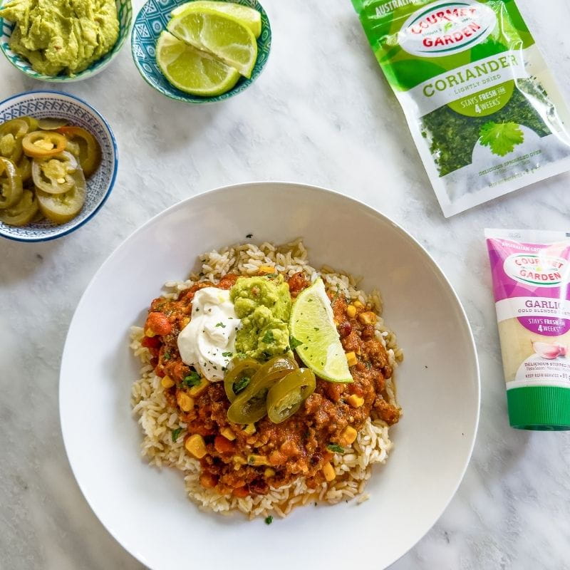 - 5 Serve hot with your favourite toppings such as sour cream, grated cheese, avocado, and Gourmet Garden Lightly Dried Coriander.