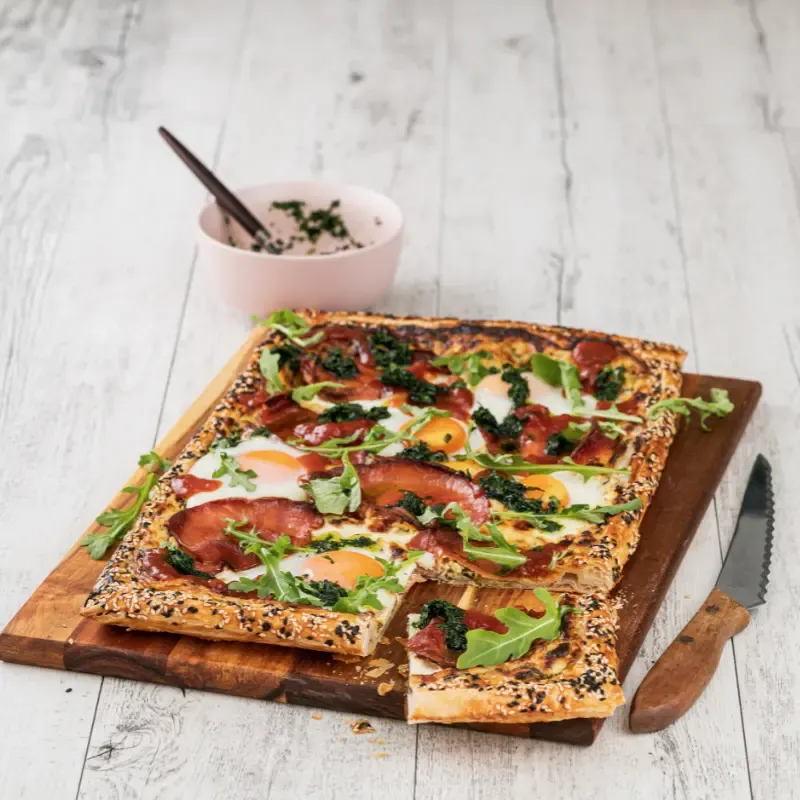 - 3 Place sour cream, cheese, mustard, garlic and 1 tablespoon each of the chives and parsley in a bowl. Season and stir to combine. Spread the cheese mixture evenly over the pastry “tart” base to the edges of the border. Position the bacon randomly on cheese mixture. Bake for 20-25 mins or until the pastry is lightly golden brown and puffed.