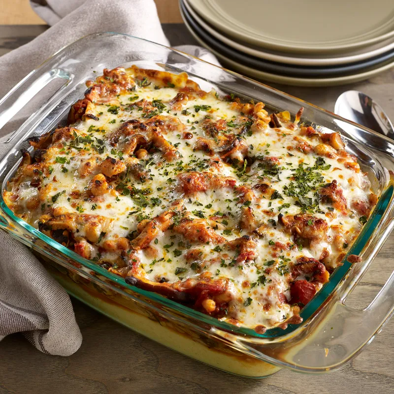 - 3 Heat oven to 180 degrees. Spread mushroom sauce over polenta. Top with cheese. Bake covered for 30 min. Remove cover; bake 10-15 min. until edges are bubbly. Sprinkle with remaining parsley.