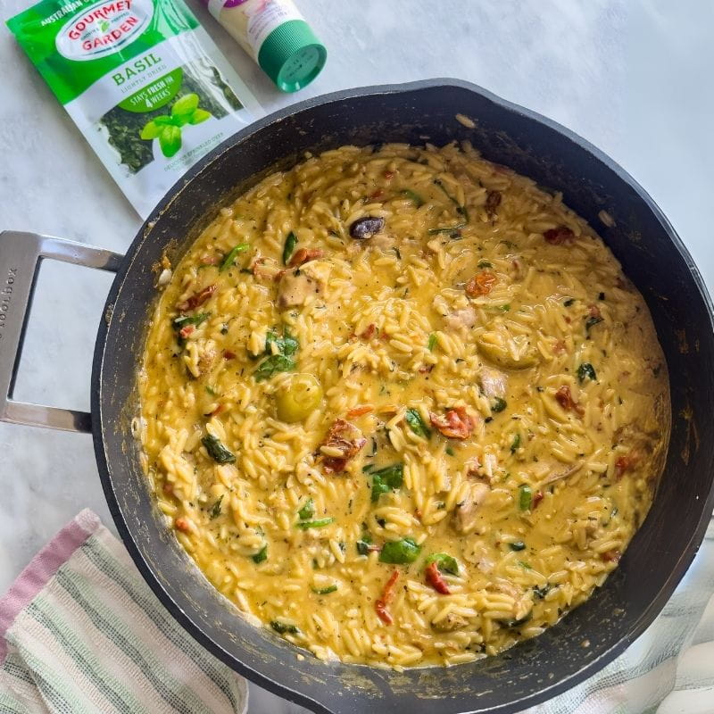 - 5 Turn off heat. Add Gourmet Garden Lightly Dried Basil and baby spinach. Stir until spinach is wilted and everything is well combined.