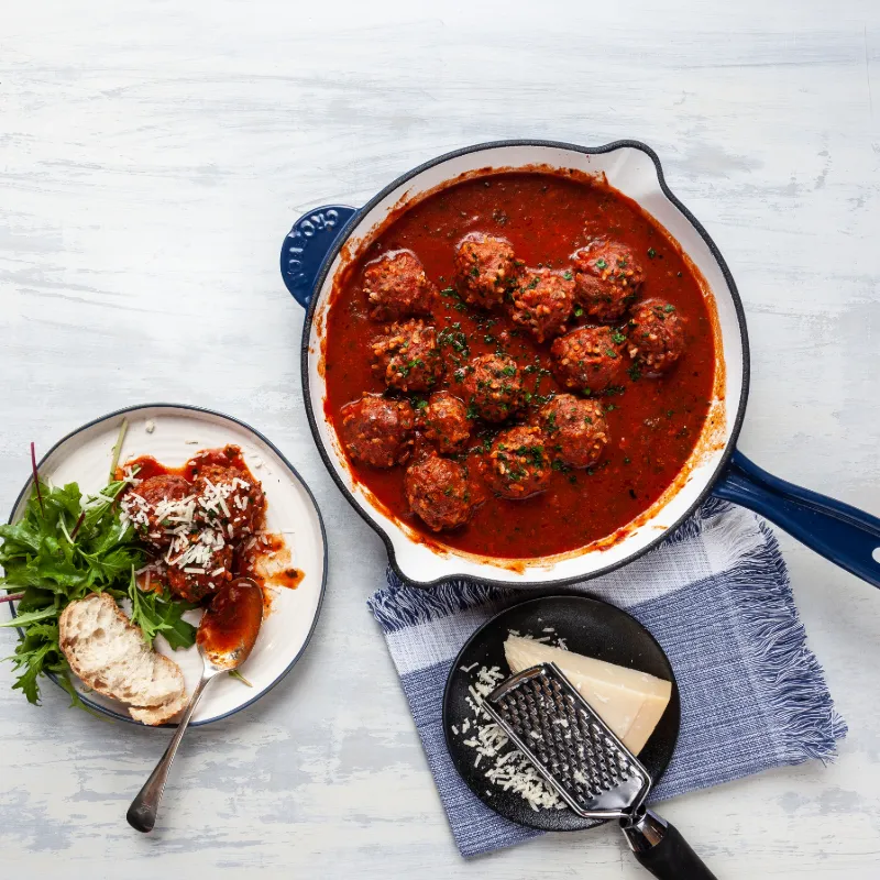 - 1 Combine mince, egg, rice, Garlic Paste and 1 tablespoon of Lightly Dried Basil. Season well with salt and pepper. Roll mince mixture into 16 even sized meatballs.