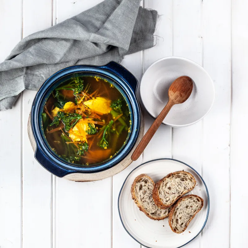 - 2 Bring to a simmer over a low heat add chicken and broccolini cook for 5 – 10 minutes until chicken is cooked through and flavours have infused into the stock.