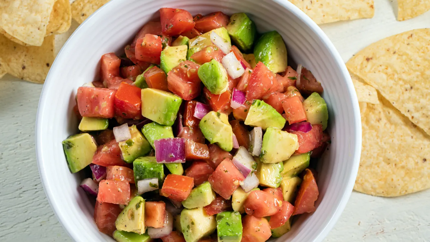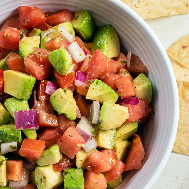 - 1 Drain diced tomatoes in a colander to remove some of their juice. Place tomato, avocado and onion in a bowl and gently stir using a fork to combine.
