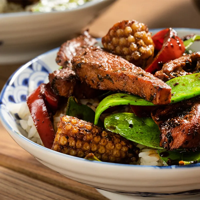 - 2 Stir-fry for 10 to 15 minutes with red and green pepper, baby corn and snowpeas.