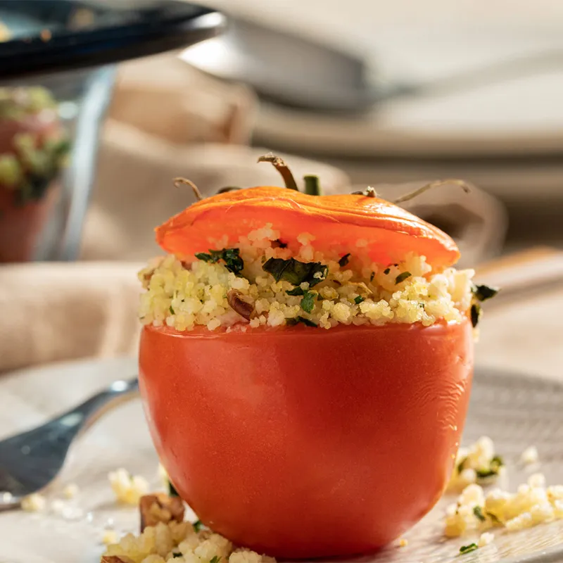 - 2 Whisk olive oil, lemon juice, Basil, Parsley, lemon zest and salt in a medium bowl until well blended. Stir in couscous and pecans. Arrange tomatoes in an 8-inch (20-cm) square baking pan sprayed with no stick cooking spray. Stuff tomatoes evenly with couscous mixture. Replace tomato tops.