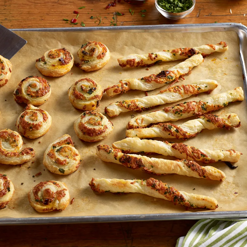 - 4 Slice the puff pastry crosswise with a pizza cutter into 1 1/2cm wide strips. Twist each strip into a tight coil. Place on prepared baking sheets leaving space between each one. Or roll the dough into scrolls and slice 2cm thick.