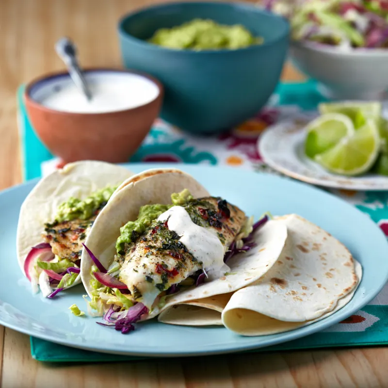- 4 Cook the marinated fish in a hot oven for 8 minutes or until just cooked through. Warm the tortillas. Pour the pickled onions over the shredded lettuce and cabbage and toss gently. Serve with guacamole and spiced sour cream.
