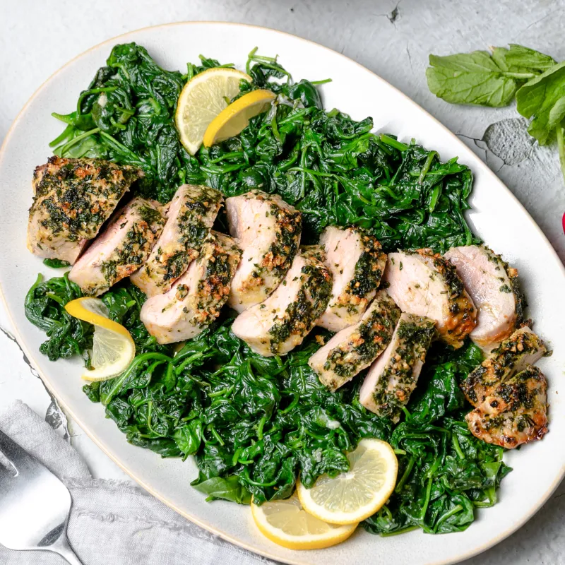 - 5 Place sliced pieces of tenderloin over spinach and serve immediately.