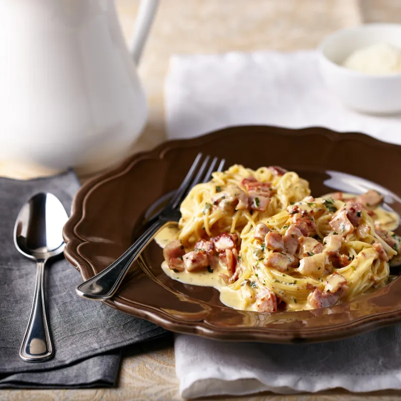 - 4 Beat the eggs and the milk together and then pour over the pasta, stir and allow to sit until the sauce has thickened up. This will only work well if the pasta is still hot as it needs the heat to ‘cook’ the eggs.