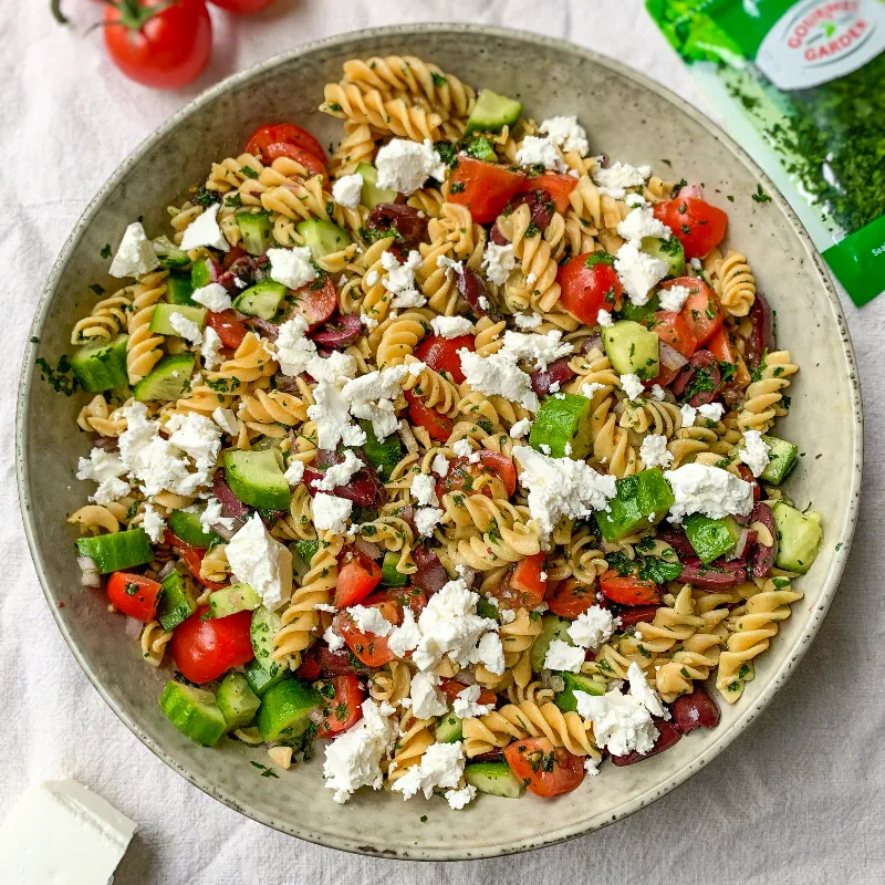 - 2 Add pasta and all other salad ingredients except the feta cheese to a large serving bowl and mix well to combine.