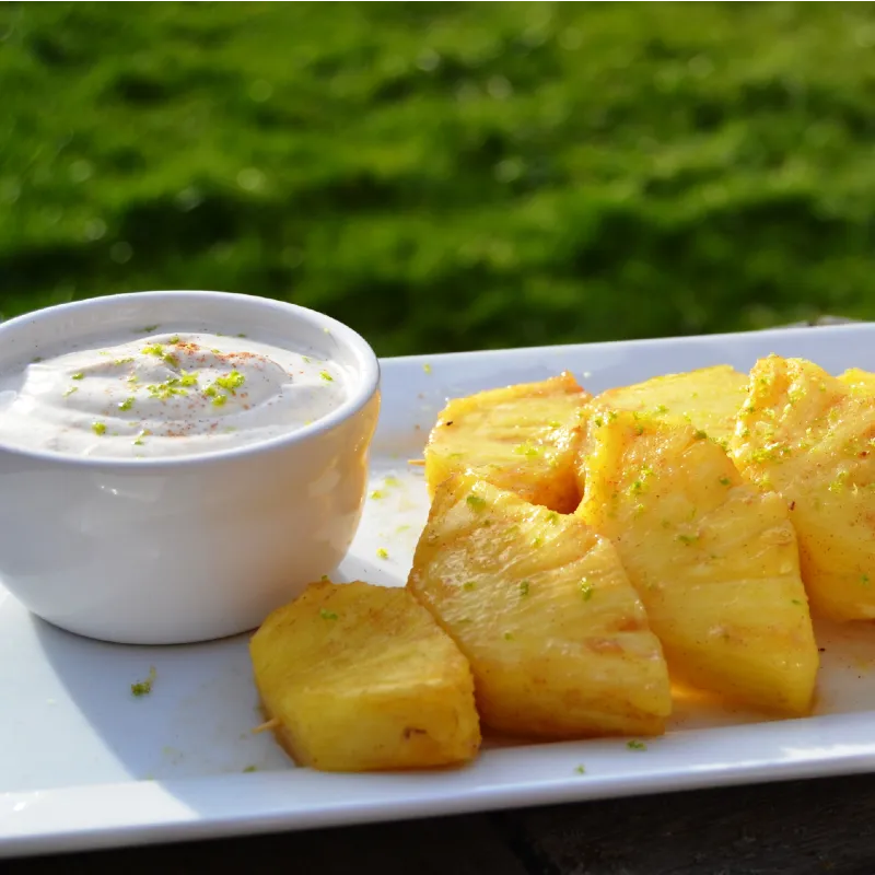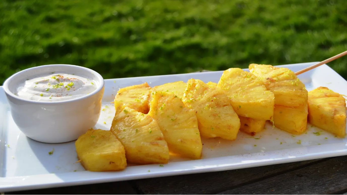 - 6 When the pineapple is cool, thread six pieces onto each skewer. Spoon the juices from the roasting dish over the pineapple and garnish with lime zest before serving with the Greek yoghurt dip.