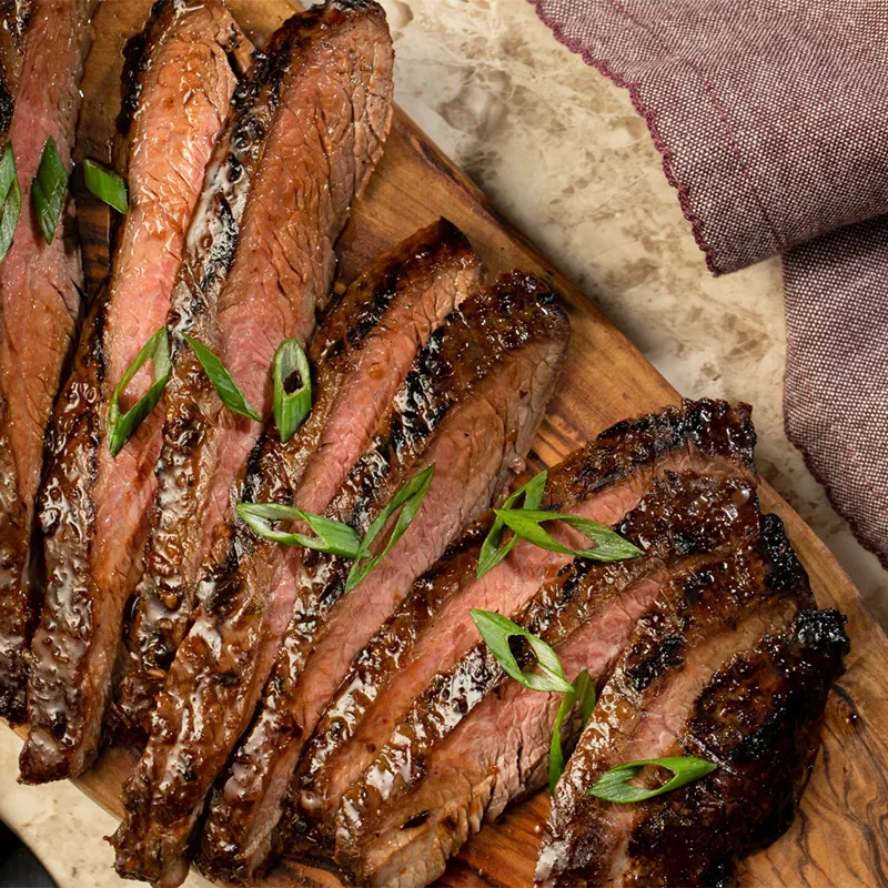 - 2 Griller à feu moyen de 6 à 8 minutes par côté, ou jusqu’au point de cuisson désiré. Laisser reposer 5 minutes. Pour servir, trancher finement la viande en biais, dans le sens contraire des fibres.