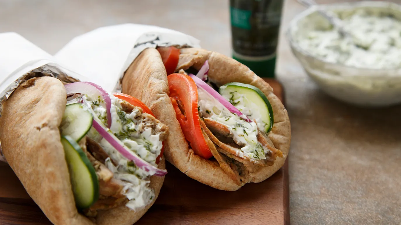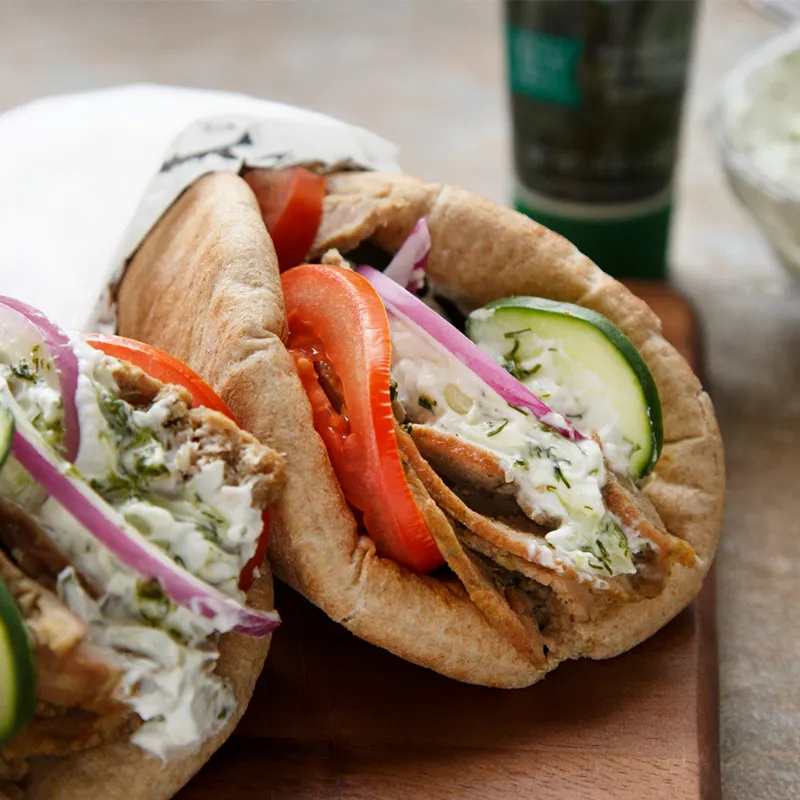 - 3 Trancher le dindon finement. Servir dans des pains pitas et napper de sauce tzatziki. Garnir de tranches de tomate, d’oignon rouge et de concombre.