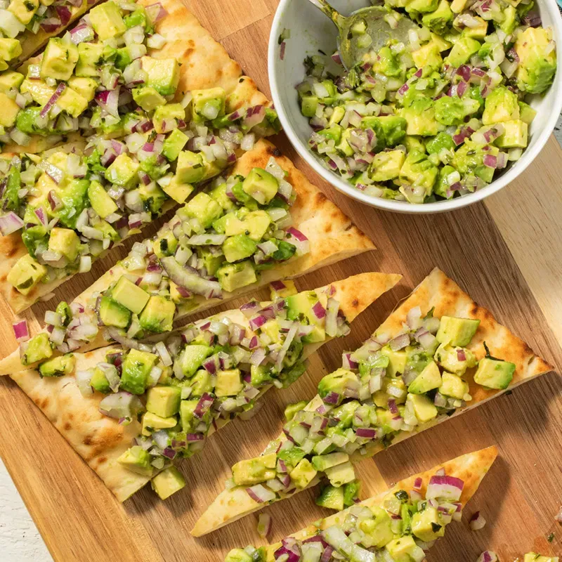 - 2 Couper les pains plats en triangles et servir avec la salsa aux avocats.