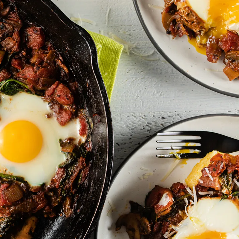 - 4 Casser chaque œuf dans son puits, et saler et poivrer au goût. Couvrir la poêle pendant 4 minutes ou jusqu’à ce que les blancs d’œuf soient cuits, mais que les jaunes demeurent mous ou un peu liquide. Servir immédiatement sur du pain croûté ou de la polenta. Garnir de copeaux de parmesan, si désiré.
