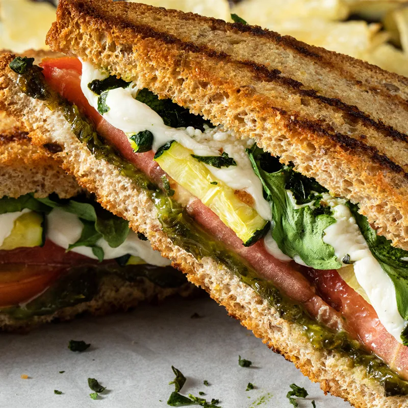 - 1 Faire chauffer un four à panini ou une grande poêle. Ajouter les tranches de courgette et cuire de 3 à 5 minutes, jusqu’à ce qu’elles aient ramolli. Retirer et réserver.