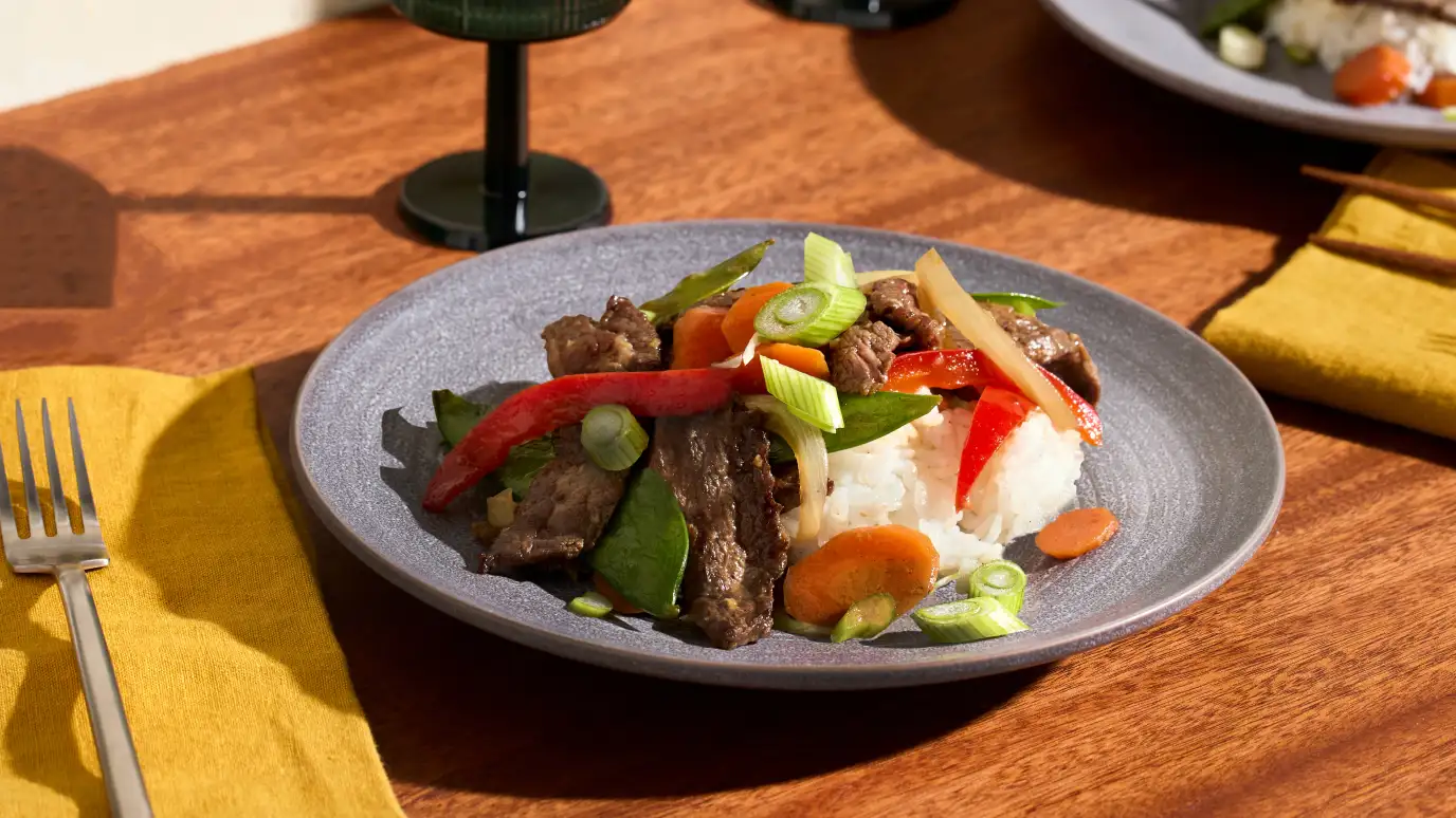 - 2 Chauffer 1 c. à table (15 ml) du reste de l’huile dans un wok ou une grande poêle profonde à feu moyen-élevé, jusqu’au point de frémissement. Ajouter le bifteck; faire sauter 5 minutes, ou jusqu’à ce que la surface ait bruni. Retirer le bifteck de la poêle. Chauffer le reste (1 c. à table/15ml) de l’huile dans la même poêle. Ajouter les légumes et le reste de la pâte de gingembre et d'ail; sauter 5 minutes ou jusqu’à ce qu’ils soient légèrement croquants.