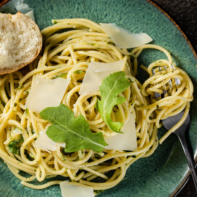 - 2 Dans un grand bol, combiner l’huile d’olive, la pâte d’ail, la pâte de basilic, le persil légèrement séché et le fromage parmesan. Incorporer 1/4 tasse (60 ml) de l’eau de cuisson réservée, en remuant. Ajouter les pâtes et la roquette, puis mélanger pour bien enrober. Saler et poivrer au goût.