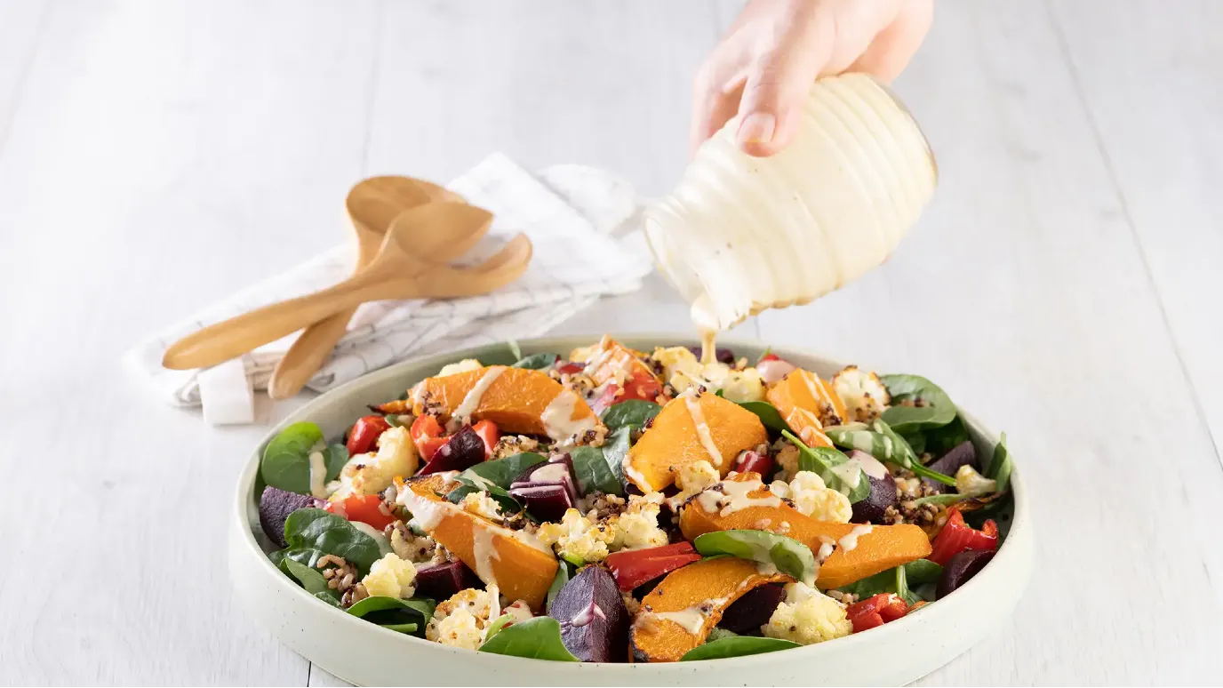 Salade de patates douces rôties, de poulet et de chou frisé avec coriandre