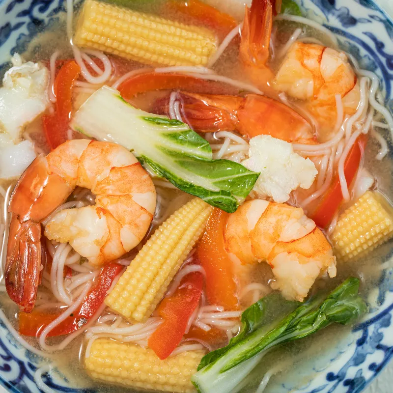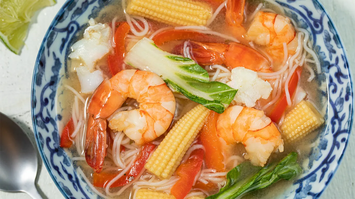 - 3 Ajouter le maïs miniature, le poivron rouge et les nouilles de riz. Laisser mijoter 5 minutes.